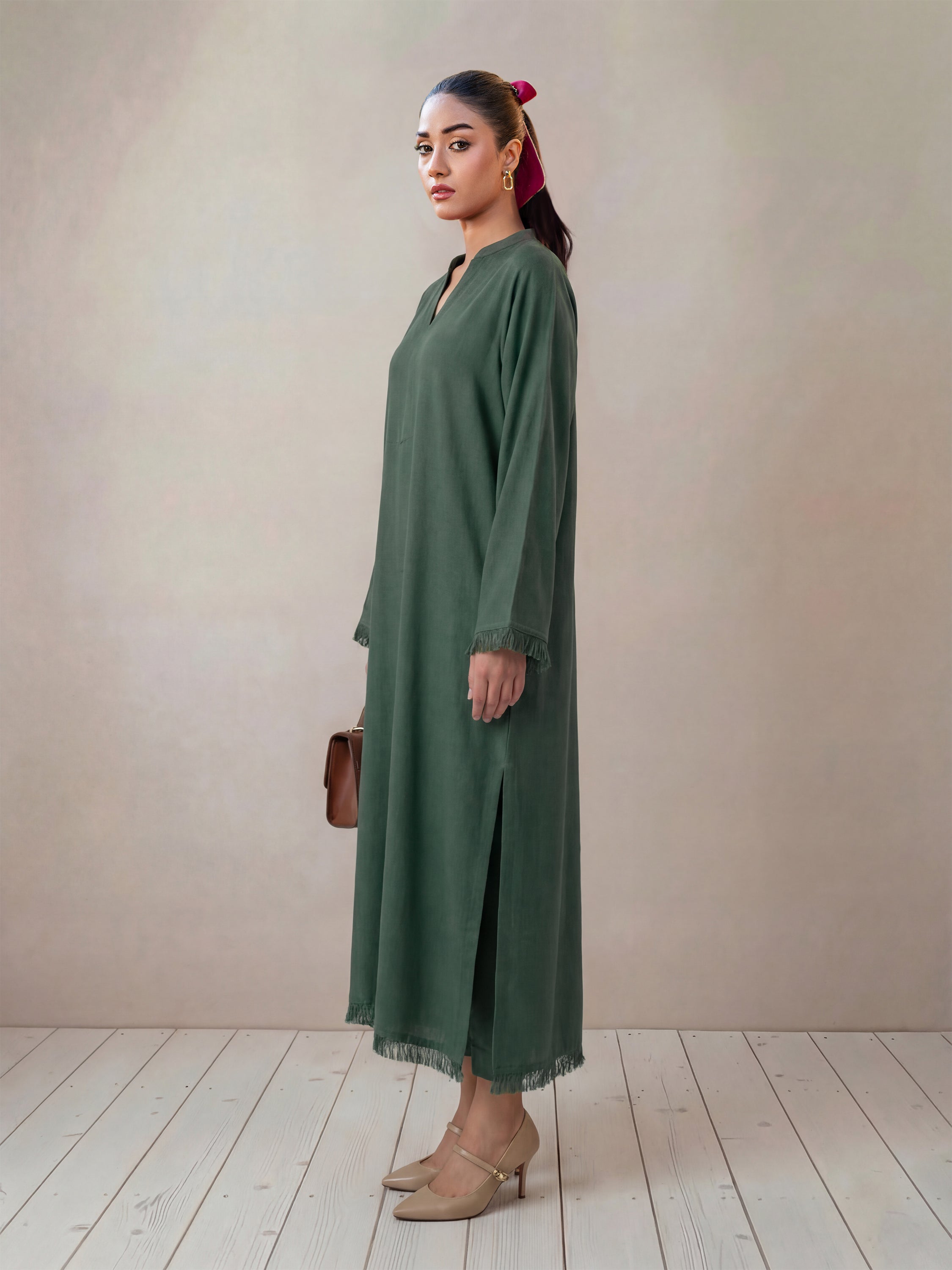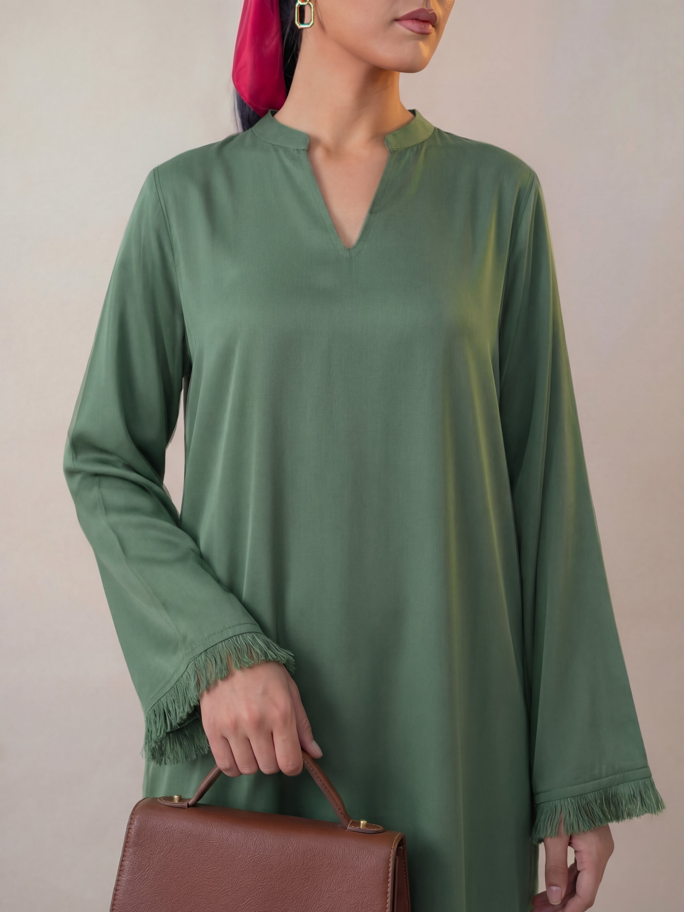 Crafted in buttery soft georgette, this statement shirt features a contemporary oversized cut for effortless elegance. Finished with delicate thread fringe detailing along the sleeves and hemline, this outfit is the epitome of luxury and sophistication.