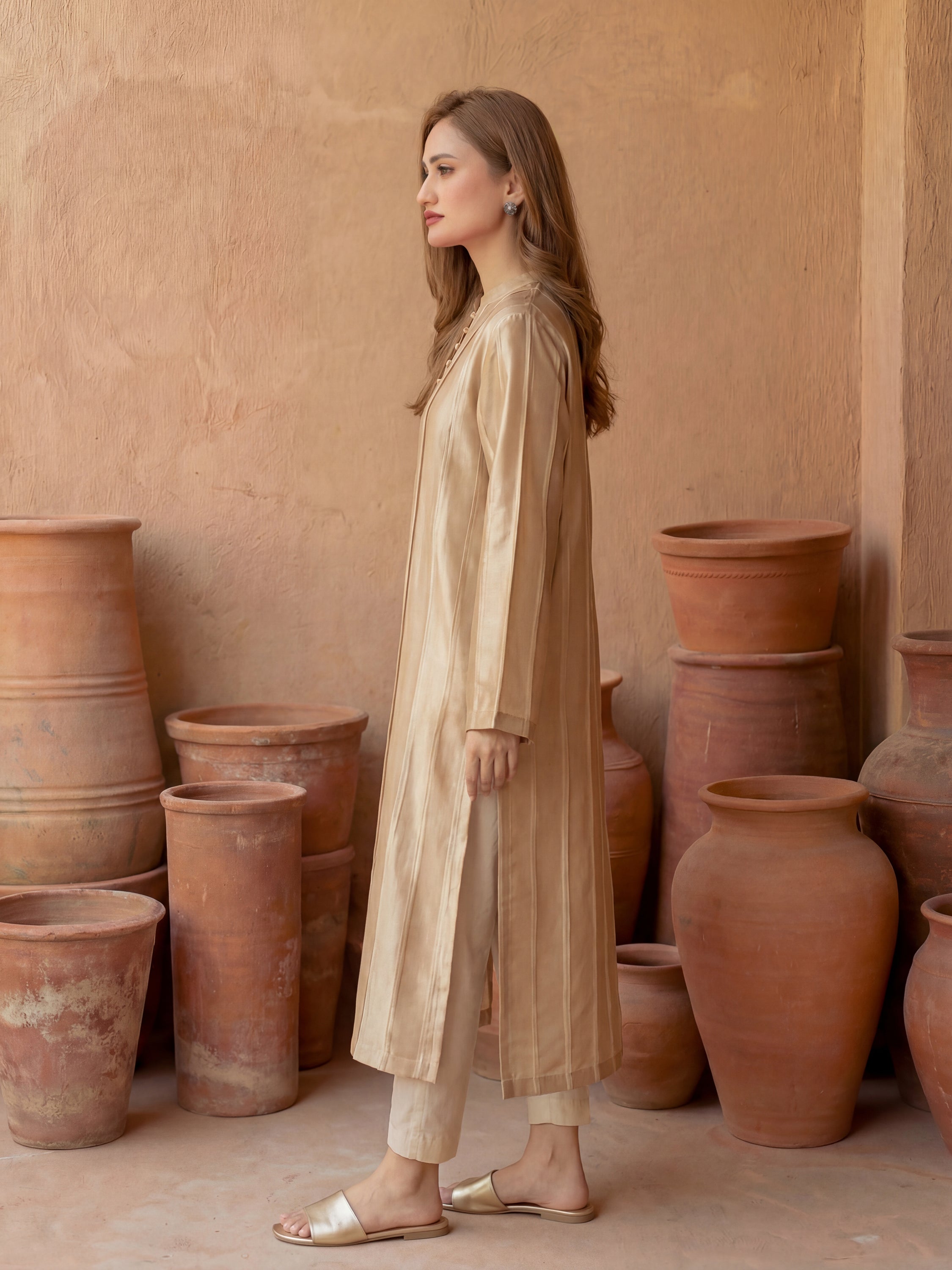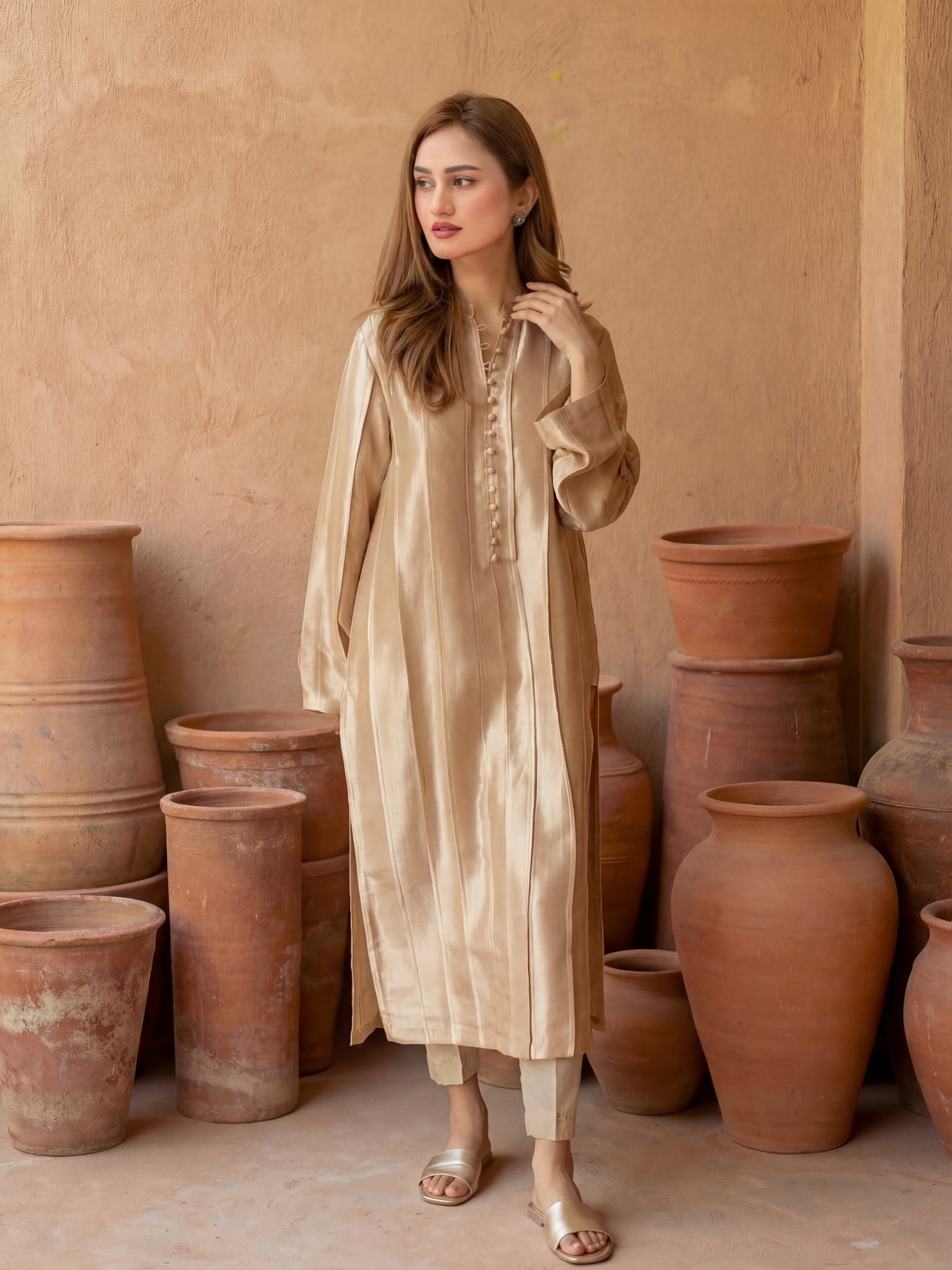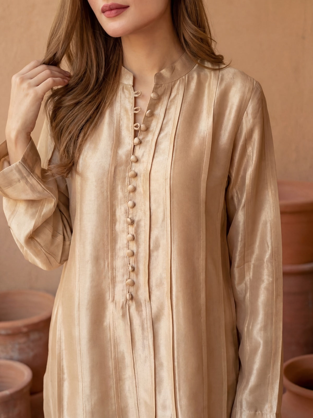 Crafted in premium kattan silk, the Kinza Set features elegant pintucks throughout for a structured yet fluid look. Finished off with handmade fabric buttons, the shirt blends timeless craftsmanship with contemporary style—perfect for an elevated, effortlessly chic look.