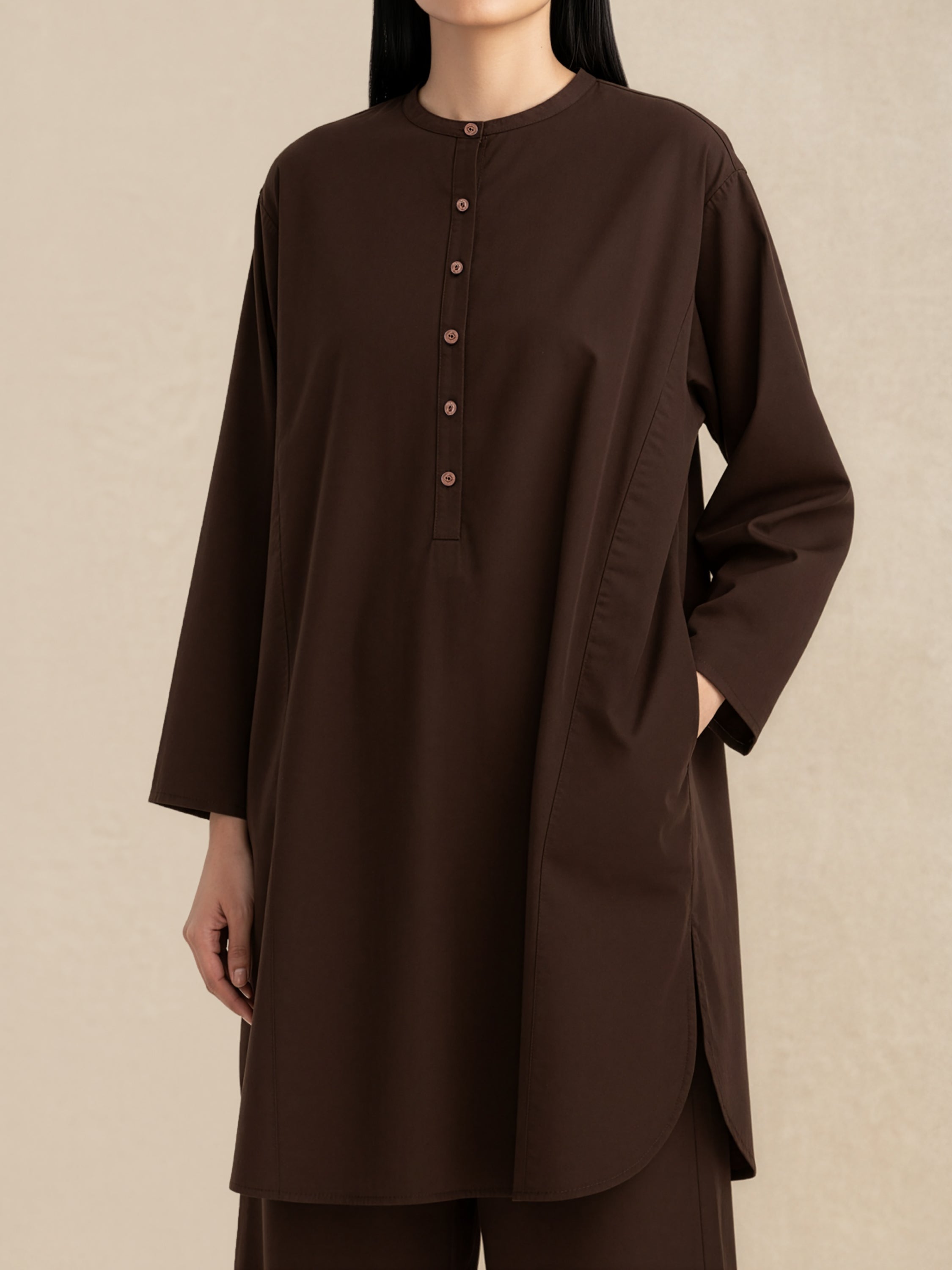 Tailored in breathable cotton Irish linen, this co-ord set features an elevated oversized shirt with subtle button detailing and functional pockets, paired with relaxed, baggy-fit pants. Designed for effortless sophistication, it blends contemporary high-end style with refined modest wear appeal.